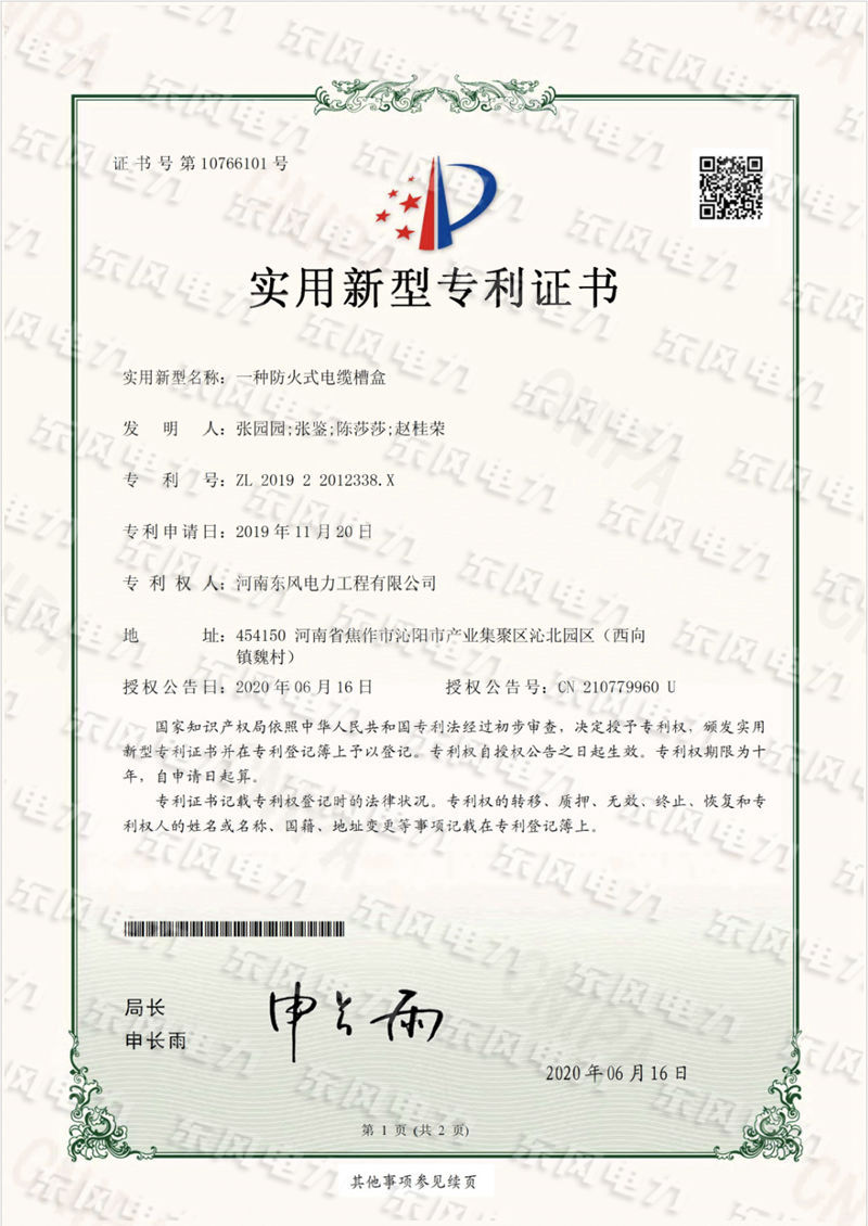 一種防火式電纜槽盒-實(shí)用新型專利證書