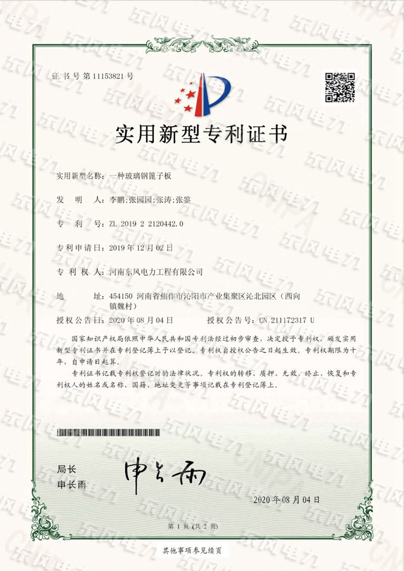一種玻璃鋼篦子板-實(shí)用新型專利證書