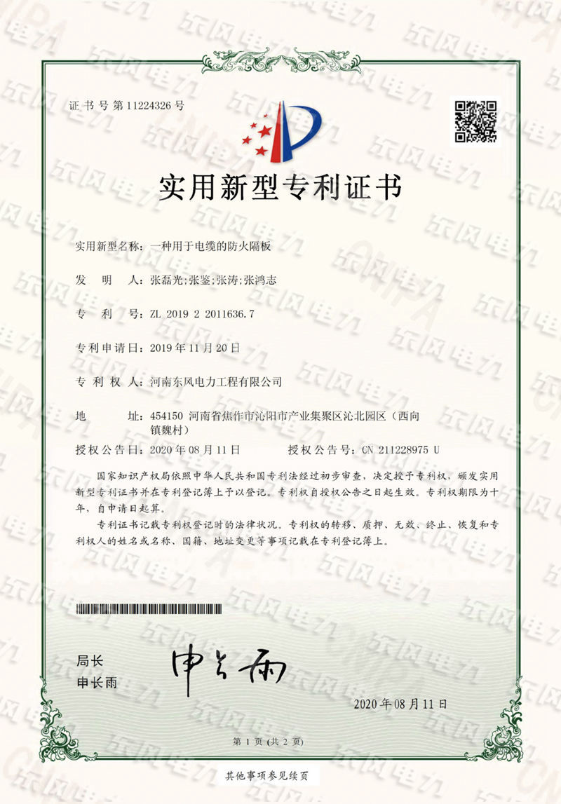 一種用于電纜的防火隔板-實(shí)用新型專利證書