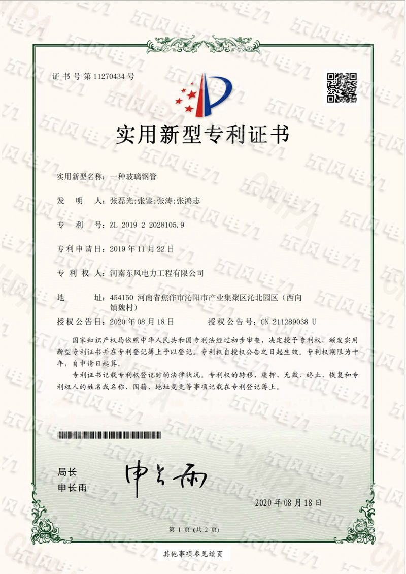 一種玻璃鋼管-實(shí)用新型專利證書