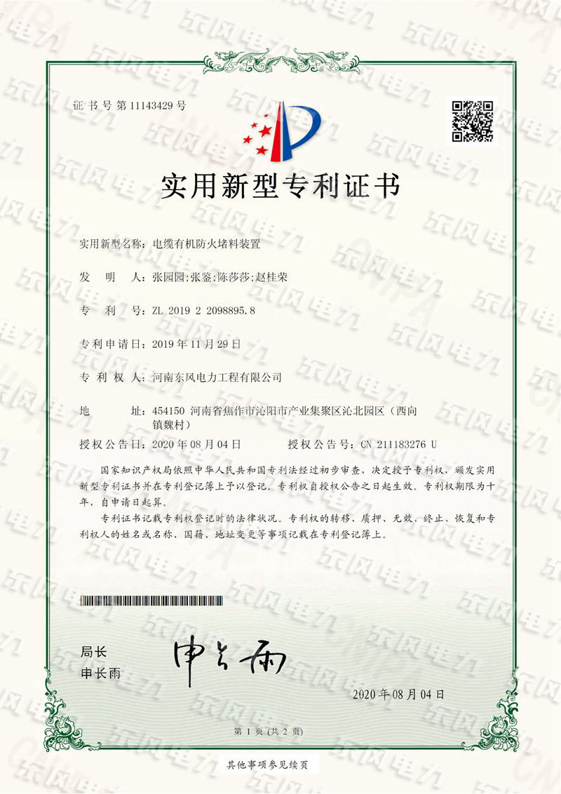 電纜有機(jī)防火堵料裝置-實(shí)用新型專利證書(shū)