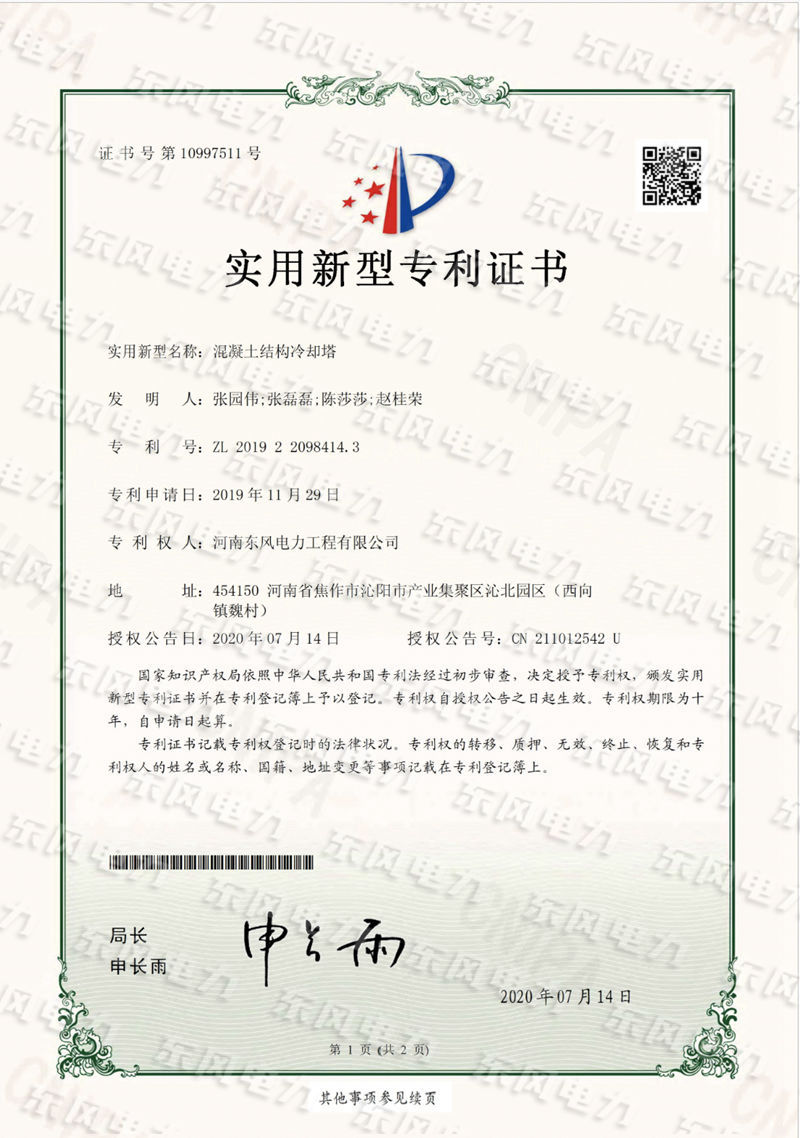 混凝土結(jié)構(gòu)冷卻塔-實(shí)用新型專利證書(shū)